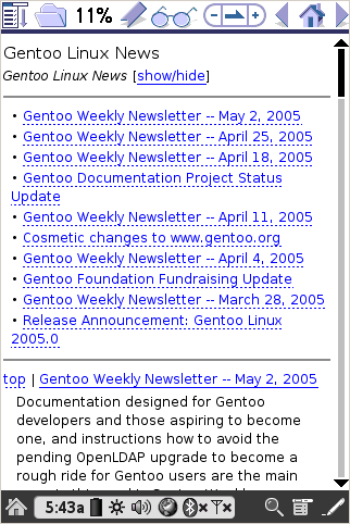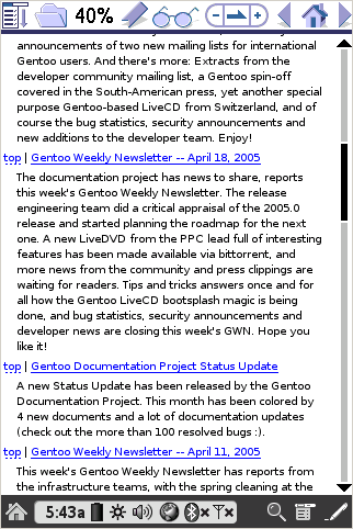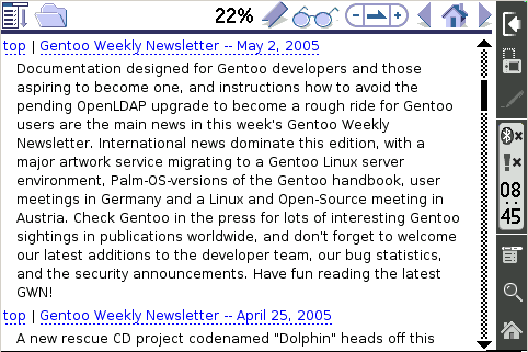 You can see some screenshots below of what it looks like when this same content is rendered and converted to Plucker format (as well as a screenshot of the original upstream HTML rendition) using the 12pt and 10pt anti-aliased fonts I created for Plucker users. |