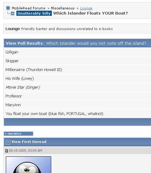 Was that too over the top? They claimed they voted for Ginger yet when I look at the poll Ginger's name is slanted indicating that I voted for her [and I did much earlier in the poll.] In many ways Ginger was a deer caught in the headlights kind of person. In her own way she was a lot puppy. Last edited by RWood; 08-25-2009 at 02:13 AM. |