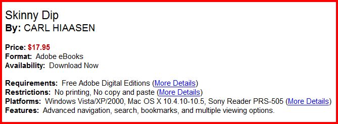 http://www.booksonboard.com/index.ph...76884&v=buynow http://www.diesel-ebooks.com/cgi-bin...Dip-eBook.html http://ebooks.ebookmall.com/ebook/135627-ebook.htm Also.. http://www.fictionwise.com/ebooks/b2...-Hiaasen/?si=0 Last edited by dreams; 07-10-2009 at 10:54 PM. Reason: pronoun clarification |