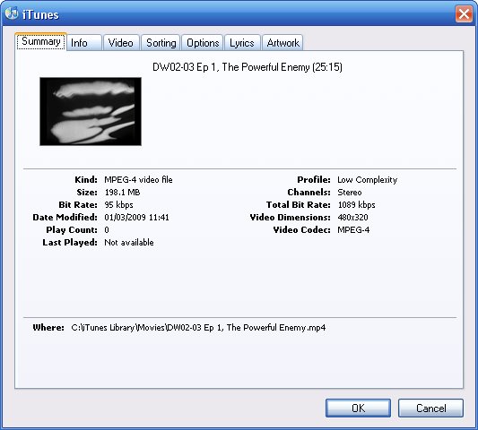 No videos from file sharing sites; they're all converted from DVD (bought bought ones and recorded from TV), converted using a program called "Aimersoft DVD to iPod Converter". |