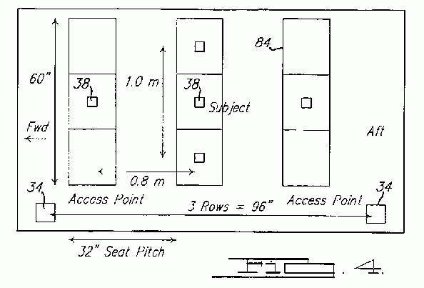 Connexion by Boeing, the division of the aircraft maker that has leased satellite transponders around the globe to provide airborne broadband access, has just been granted a patent for their on-board WLAN technology. Patent 6,990,338 describes"A wireless local area network adapted for use by users traveling on a mobile platform such as an aircraft. The network includes a network server located on the mobile platform, and at least one network access point connected to the server and accessible wirelessly by at least one user portable electronic device over one of a plurality of non-overlapping network frequency channels. The RF characteristics of this wireless network are specifically tailored to meet applicable standards for electromagnetic compatibility with aircraft systems and RF exposure levels for passengers and flight crews." The wireless network is described as such that it can be accessed by connected notebooks and handhelds without causing interferences with the navigation and communication systems on board the aircraft. The first attached image is a view of a WLAN adapted for use on an aircraft; the second image is a graph of E-field strength of emissions versus transmitter-to-victim distance; and the third is a view of a portion of a passenger cabin, shown from above the overhead area, in which more than one connected mobile device is in use. Related: Connexion to start airborne Internet TV, Alex speaking from Flight LH 432 |
