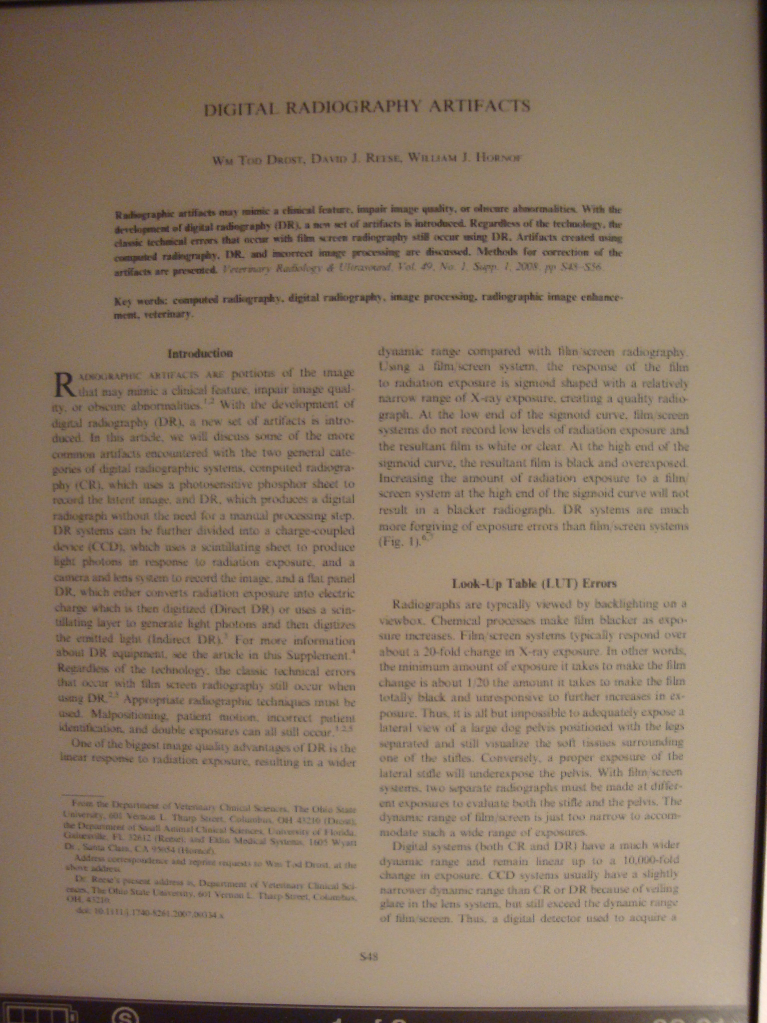 I have handled a Sony Touch demo unit and didn’t have an issue with screen contrast, it seemed to mechanically fit well in my hand, etc. 1) PDF files—I’ve seen some info suggesting the Sony does these quite acceptably. Others say it sucks. Still others say it’s fine if you manipulate the file in some way to optimize it. I do not now how to do this and have minimal interest in learning how. Most of what I will be reading is from sources like this. If anybody could give me a screen shot (this page links to a free content edition of the journal, so I don’t THINK copyright is an issue), I would be deeply grateful. Even better would be a few different ones (portrait vs. landscape, different magnifications, etc). Image display isn’t as important as you might think as long as the text displays in a readable fashion. 2) Taking notes—It is currently my habit to print out articles from journals to read, and to jot down notes in the margins. I tried this in the Sony demo, but couldn’t figure out how to ever see those notes again. The highlighted bits I tried seemed to work fine? I don’t necessarily need to save the notes forevermore (e.g. to print out or to e-mail to somebody), but when I look back at that article in a week or a month I need to have the notes. I know the first release of the Irex is not supposed to have note-taking ability, but they say that will come out as a firmware update. Does Irex have a reputation of living up to such promises? 3) Stylus—I know the Sony is basically a pointed stick and any similar object can be used. I understand that the Irex has some kind of unit-specific device. I tend to lose things. Anybody know how much that would be to replace? If it’s not a literal TOUCH screen, do you have to have that specific stylus to operate the thing at all, until you get a replacement? Or is there some method of limping along and still read? 4) File organization—again, largely PDF files, not books. Once I have an article on there, I need to be able to find it again. Ideally, I would want to file it under many different categories (e.g. “MRI”, “Equine Orthopedics”, “November Journal Club”). Subfolders would be great but I can survive without them. 5) Bookmarks—can you bookmark files (not books)? Can you have more than one bookmark in a file or is it strictly a means of getting back to the last page you were on? 6) Ease of transfer—Can I hook the unit up to any (PC) computer and dump files onto it the way I can a jump drive? Or does there have to be some kind of reader software on the computer that it goes though? I’m a bit of a nomad at work, working on a variety of public stations. I want this to be as easy (or almost as easy) as selecting “print” and walking to the nearest networked printer. It would be a big fat drag if I had to dump files onto a jump drive, walk back to my private office (which is two floors up and technically in a different building from where I actually work), upload those files into a library program of some kind, then transfer them onto the device. Add some kind of conversion step in there and it’s probably a deal killer. 7) Random notes—it seems like the Sony can easily function as an electronic notepad to jot down a few things as they come along. Can those files be organized in any way into folders, or is it just a list. This isn’t a deal killer, it can’t be any worse than a literal pad of paper. Or the billions of little scraps of random paper I collect because I don’t have a pad with me. 8) Wireless—other than buying books while sitting in a coffeeshop, what’s in it for me? I’m sure I’ll do some recreational reading with the thing, but it’s not a problem to hook up to a computer to download books for me, even if it’s one specific computer that I need to go to (unlike the PDF issue). Also, does anyone know if the Sony Wireless for the Daily is “free” or if there is a monthly fee? I willing to pay a bit more upfront for the Daily for the larger screen (I think, I want to compare it side-by-side with the Touch first). But I don’t want to pay monthly for a service I’m unlikely to use. I understand the Irex wireless is free? I’m sure I’ll come up with more stupid questions, bear with a poor ignorant soul! |