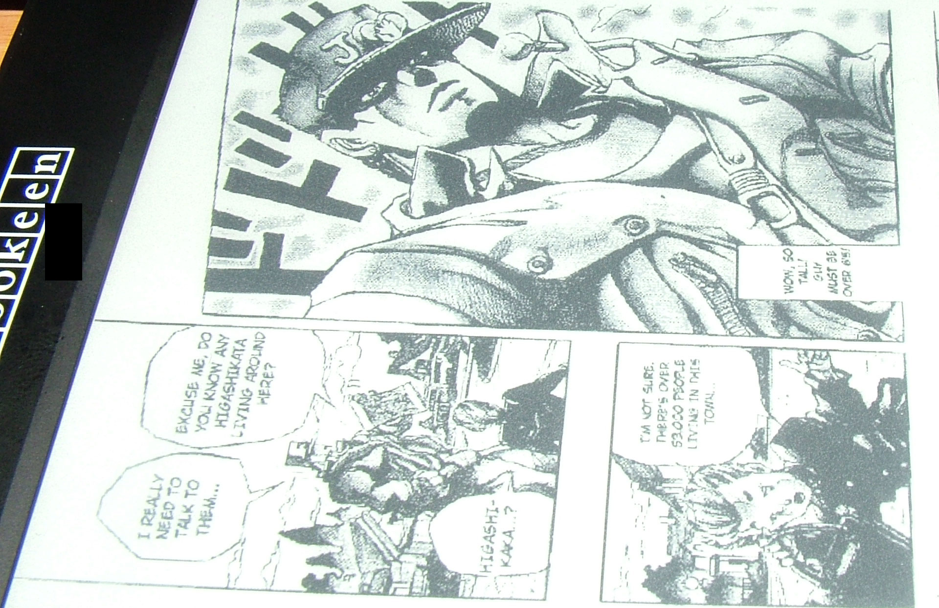 However opened them in photoshop using the settings that you said you had used...I can't really answer your question since they failed to load, but hopefully a kind sony user should be able to help ! =D In that place, i'll make my own images using these settings for you and see how they turn out. In my own images (which I can't show due to licensing issues) the text is crystal clear on both...With 248DPI the image is unreadable at 100%, but stretched it is (quality is same as 166DPI when stretched) Okay, attaching some pictures at the bottom of this post to show example of bad resizing/indexing etc jojo166dpi shows a standard page resized using 166DPI at 800 pixels, this is the PDF at 100% and there are no errors at all..perfectly readable =D jojo43percent shows what happens when an image is too large for the device and is being shrunk, you may see some strange text issues (these will be shown using other examples too) Drifters is a fantastic series ! one of my friends is an assistant to the Mangaka...however, the image was converted using calibre's cybook profile...the PDF is too small and this shows the sort of strange text issues when resizing up or down ;___; rave166dpi shows small text, image is converted and formatted using the same settings as jojo166dpi ! finally jojoindexed is an example of the errors when changing the color profile to a bad color scheme before resizing...The text issues are similar to that of the PDF Resizing using a mobile device... The important thing to remember when making the PDF's using photoshop is to make sure DO NOT DOWNSAMPLE is enabled, if it is enabled =/ well, the image just turns out as unreadable/hard to read junk >.< Good luck again ! |