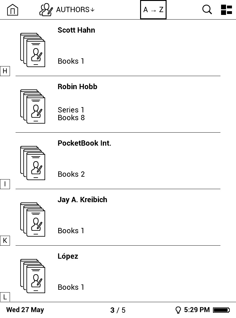2) I'm nearly positive that the InkPad X does NOT come with a cover — unless they handle this differently in Italy. 3) The PB615 (and, I assume, all PocketBooks) default to putting books in folders by author. (See screen captures.) 4) Calibre works fine with my PocketBook, though I'm not doing anything special with it. Just moving books to the PB615. The PocketBook also likes my Constantia font. I've given a couple samples of what a 6" screen looks like (one with the status off – for full page – one with it on). I like the clean screen. EDIT: I've added a 5th screen capture to show what viewing choices PocketBook (at least version 5.17.xxx) gives you. Last edited by rcentros; 05-27-2020 at 08:57 PM. |