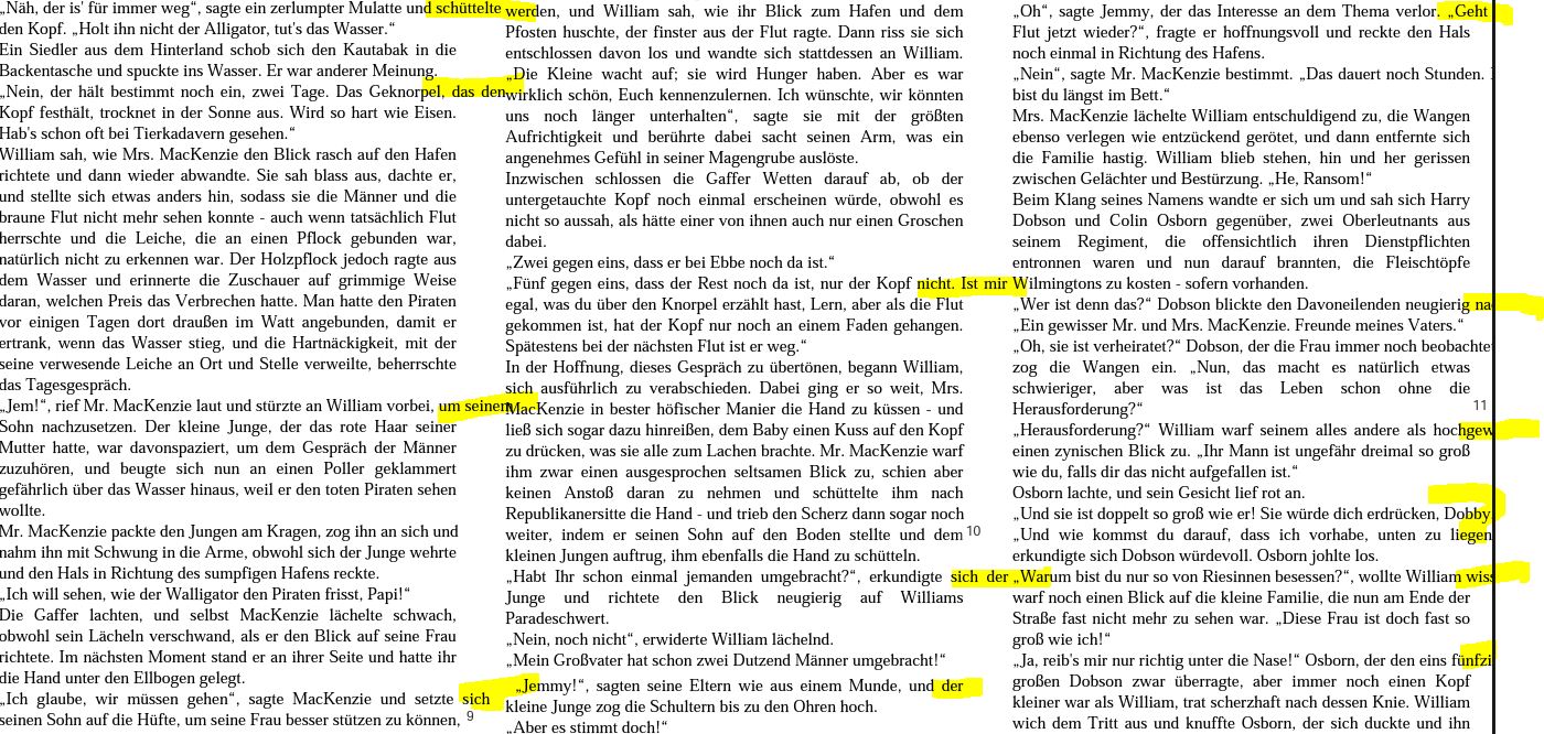 Habe ein ebook fertiggestellt - über 1000 Seiten. Nach der Konvertierung »calibre« in epub - ergibt es in ADE einen Zeilenüberlauf. Text:: Der Kopf des Piraten war verschwunden. William hörte, wie einige Zaungäste nebenan auf dem Kai darüber spekulierten, ob er wohl noch einmal auftauchen würde. „Näh, der is' für immer weg“, sagte ein zerlumpter Mulatte und schüttelte den Kopf. „Holt ihn nicht der Alligator, tut's das Wasser.“ Ein Siedler aus dem Hinterland schob sich den Kautabak in die Backentasche und spuckte ins Wasser. Er war anderer Meinung. „Nein, der hält bestimmt noch ein, zwei Tage. Das Geknorpel, das den Kopf festhält, trocknet in der Sonne aus. Wird so hart wie Eisen. Hab's schon oft bei Tierkadavern gesehen.“ Code: Der Kopf des Piraten war verschwunden. William hörte, wie einige Zaungäste nebenan auf dem Kai darüber spekulierten, ob er wohl noch einmal auftauchen würde. <br> „Näh, der is' für immer weg“, sagte ein zerlumpter Mulatte und schüttelte den Kopf. „Holt ihn nicht der Alligator, tut's das Wasser.“ <br> Ein Siedler aus dem Hinterland schob sich den Kautabak in die Backentasche und spuckte ins Wasser. Er war anderer Meinung. <br> Konvertierung in lit - o.k in pdf - o.k lrf - o.k. Vorschau in Calibre auch o.k Wie sollte ich eventuell die epub - Ausgabe einstellen? In der Anlage sende ich mal eine Kopie, wie es in ADE aussieht. Hilfe ist nötig!!!!!!!!!!!!!!!!!!!!!!!!!!!!!!!!!!!! Last edited by Insider; 12-02-2009 at 10:47 AM. |