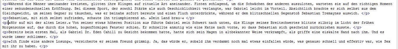 In der Codeansicht wird die html Datei richtig angezeigt - Seitenumbruch. In der Entwurfansicht nicht. Auch nach der Konvertierung mit »calibre« wird der Zeilenumbruch nicht durchgeführt. Habe nichts anderes gemacht und meine gesamten ebooks so hergestellt. Füge zur Ansicht zwei Bildschirmkopies ein: <p>Während*die*Männer*umeinander*kreisten,*glitten *ihre*Klingen*auf*rituelle*Art*aneinander.*Finten* schlagend,*um*die*Schwächen*des*anderen*auszuloten ,*warteten*sie*auf*den*richtigen*Moment*einer*seku ndenschnellen*Eröffnung.*Bei*diesem*Sport,*der*sow ohl*Stärke*als*auch*Geschicklichkeit*verlangte,*wa r*Gabriel*leicht*im*Vorteil.*Absichtlich*brachte*e r*sich*selbst*aus*dem*Gleichgewicht,*um*seinen*Geg ner*zu*täuschen,*was*er*beinahe*sofort*bereute*und *einen*Fluch*unterdrückte,*während*er*dem*blitzsch nellen*Gegenstoß*Sebastian*Tremaynes*auswich.*</p> <p>Sebastian,*mit*sich*selbst*zufrieden,*schaute*i hn*triumphierend*an.*»Dein*Land*brau-«*</p> <p>»Hör*auf*mit*der*alten*Leier.«*Von*seiner*etwas *höheren*Position*aus*führte*Gabriel*sein*Schwert* nach*unten,*die*Klinge*seines*Breitschwertes*blitz te*silbrig*im*Licht*der*frühen*Morgensonne*auf,*da s*durch*die*hohen,*bogenförmigen*Fenster*schien.*E r*schnellte*anmutig*wie*eine*Katze*nach*vorne,*so* dass*Sebastian*sich*geschwind*zurückziehen*musste. *</p> <p>Bereits*beim*ersten*Mal,*als*Gabriel*Dr.*Eden*C ahill*zu*Gesicht*bekommen*hatte,*hatte*sich*sein*M agen*in*altbekannter*Weise*verkrampft,*als*griffe* eine*eiskalte*Hand*nach*ihm.*Und*es*wurde*immer*sc hlimmer.*</p> <p>»Ich*finde*eine*andere*Losung«,*versicherte*er* seinem*Freund*grimmig.*Ja,*das*würde*er,*sobald*ih m*verdammt*noch*mal*etwas*einfallen*würde,*was*gen auso*schnell*und*effektiv*war,*wie*Sex*mit*ihr*zu* haben.*</p> |