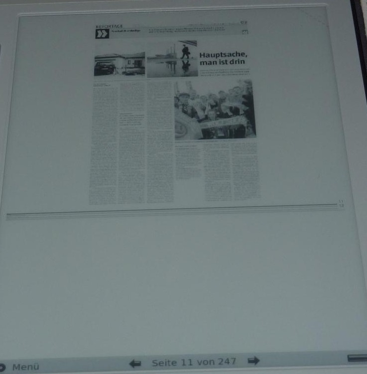 The ePub files have a special structure: First there's a bitmap of the whole newspaper page (unreadable, because of the size, but you get a feeling for "what the original page looked like"). Then the arcticles follow in text format with the article pictures. A test-issue can be downloaded here. On my Sony PRS-300 the file displays fine. But the DR800S "eats" the page breaks after the initial intro-page and no article can be read. To get a better impression, I've enclosed pictures of the DR800S displaying the file. The ePub itself is valid, I validated using the online Threepress Validator. Other ePubs so far are fine. Does anyone with a DR800S also have some strange results in displaying some ePub files? Last edited by DeReader; 02-11-2010 at 09:35 AM. Reason: Changed thread title |