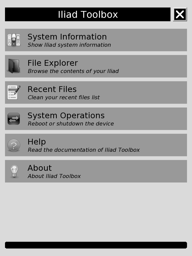 Main new features: - new file browser - system operations: reboot and power-off - readme Screenshots have been updated as well. Please, read the documentation, as some features have changed a bit. Look at the readme file. Hello, I'm pleased to announce the first public version of Iliad Toolbox, v1.1. Iliad Toolbox is a set of some useful small applications for your Iliad. Tools: - File Browser. (not implemented yet). - System Information. Shows information about: cpu, memory, battery, uptime, load, disks, processes - Recent Files. It lets you to delete some old entries in Recent Files that may pollute the list. - Power-off. I need it because the switch-off handle of my old Iliad doesn't work well. Better take a look at the screenshots to get an idea. Code: Iliad Toolbox has been written in Lua language and uses lgob (gtk+ bindings for lua), both compiled and packaged for Iliad by Great Hansel. Display refresh is handled by Hansel's xx, a small program based on Antartica's xepdmgr. You don't need to install them separately because they are included with the package (and in fact that's the reason it's so big). Installation: To install, uncompress, copy on your Iliad and run the installer from the ContentLister. To upgrade, delete the old version and proceed to install again. Btw, the install method has been created by Hansel as well. ![]() Using Iliad Toolbox: You need to use the stylus to click. The X on top-left is to close each window. Of course, all feedback, ideas and suggestions are welcome. Iņigo Last edited by Iņigo; 11-22-2009 at 06:05 PM. |