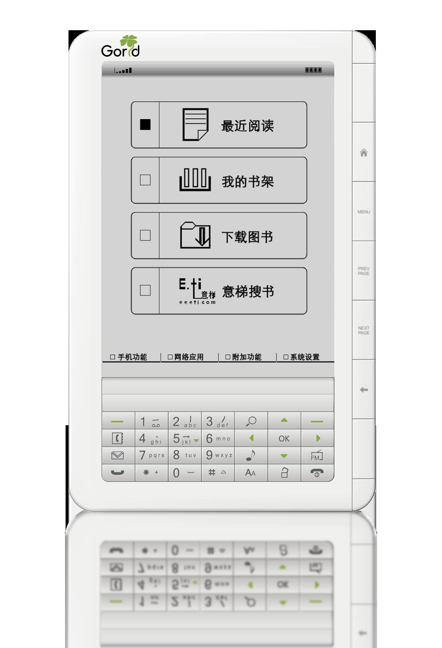 1. Recently read 2. My bookshelf (library) 3. Download books 4. ET (?) Book search The 4 buttons below the screen says, from left to right: 1. Mobile phone use 2. Network use 3. Supplementary functions 4. System settings |