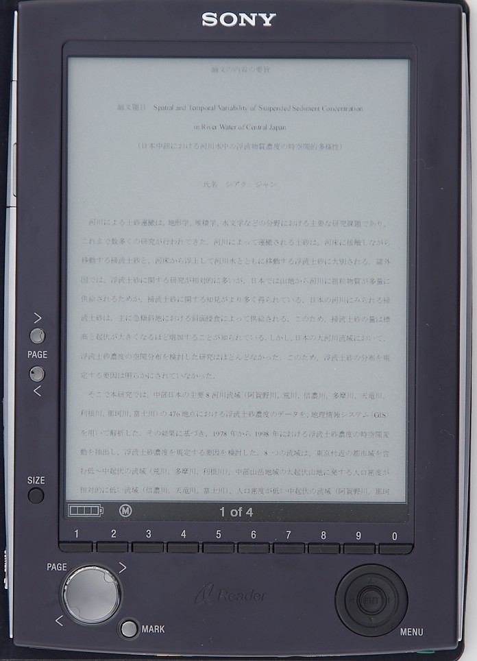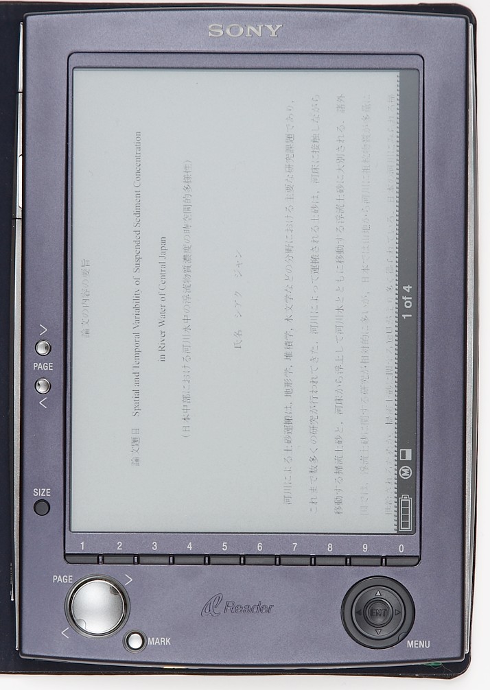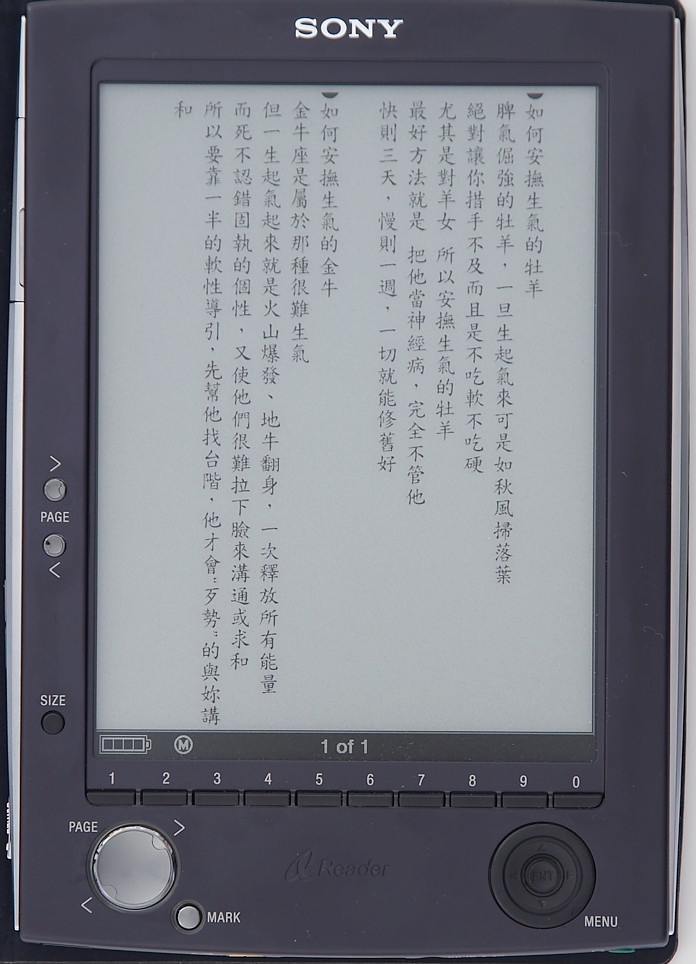 I appreciate very much that you spent a lot time to test those files and tell us the results so rapidly. The photos you took are very beautiful. Are you a professional photographer? ![]() I think the reason why JP1 and up_down_CN zoomed to "M" are quite readable is because the two files have optimal layout and font size for the size of the display of Sony Reader. (I originally edited them for my (6.4", 640*480 pixel) EBK reader.) The regular letter/A4 PDFs are really problems to most of the ebook devices since the mismatch of the layout size of PDFs and the display size of devices. Can you rotate the JP2 into the 'half page' mode? I think the basic problem is that the algorithm of Sony Reader to deal with the small size text. If the small size text can be dark rather than gray, it would be good. Oh. Adding a zoom in/out and scroll function for the PDFs, such as for the pictures, would be the best. Finally, do the Sony Reader support the CJK filename well? How many bookmarks can one book have? Do TOC and internal hyperlinks of a PDF work well? How fast is the time of loading and rate of paging the CJK PDFs (equal to an English one does)? Thanks again. Last edited by segatang; 10-04-2006 at 10:25 PM. |