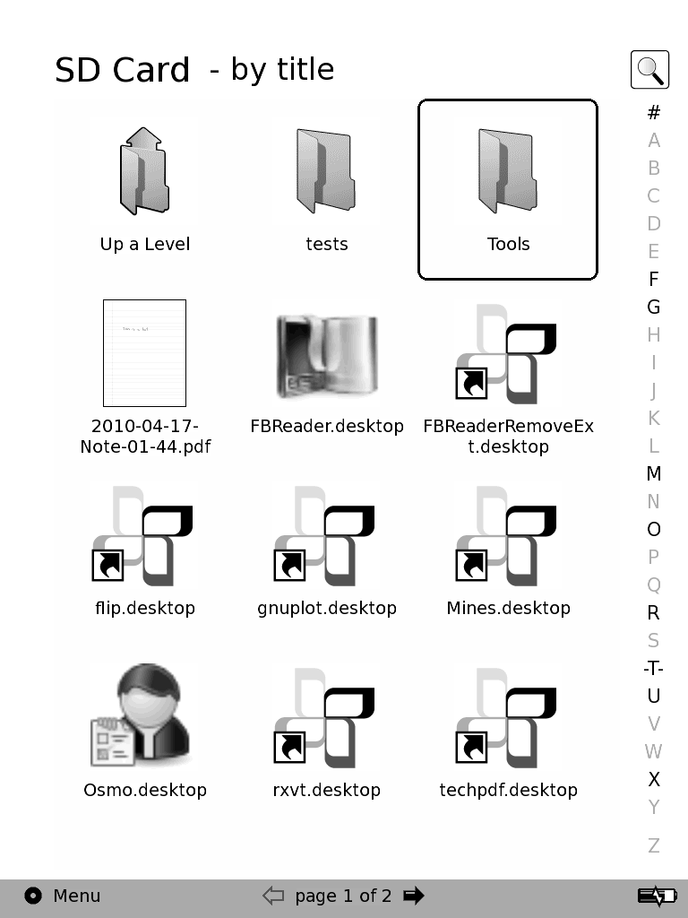 [Desktop Entry] Name=Osmo Comment=Personal organizer Exec=/media/mmcblk0p1/Programs/_osmo/bin/osmo Icon=/media/mmcblk0p1/Programs/_osmo/share/pixmaps/osmo.png Type=Application Encoding=UTF-8 Please, look at the sample lua script attached to this message. It parses .desktop files on SD/Programs, and store the specified icon image as .png data into the proper DB rows for every .desktop file with a valid icon entry. Does DR800 use a predefined default icon for .desktop files or am I doing something wrong? If this is the case, could iRex people extend .desktop files to understand "Icon", please? Thanks in advance, Iņigo Last edited by Iņigo; 05-16-2010 at 07:28 PM. Reason: Deleted script. Look message #4 |