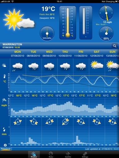 It's not as pretty as the free "Weather HD", but displays much more useful information in terms of forecasts of temperature, wind, rainfall, atmospheric pressure, and UV. A must for the "weather junkie", making full use of the iPad's screen. Screenshots below, showing what a horrible week we have in store in the UK! Highly recommended. |