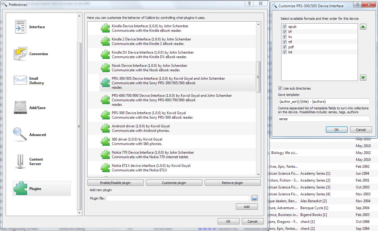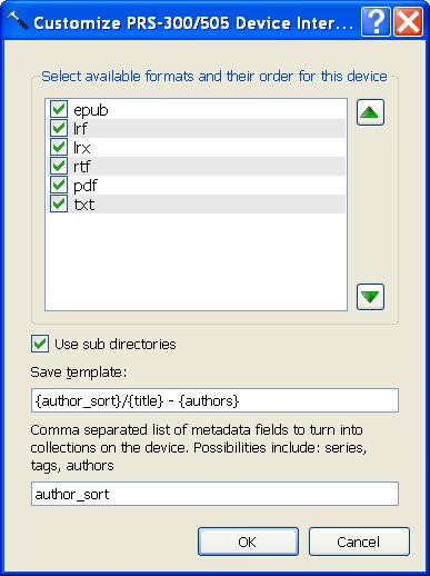 You did miss a setting. Go to Preferences - Plugins - Device interface plugins - PRS-300/505 Device interface - Customize Plugin. Here you can enter what will create a collection on your device. In the attached example collections are just created via the Author's name. I also went to metadata download plugins and in each Google, isbnDB, and Amazon unchecked download tags. This stops tags from automatically being added when you download metadata. ------- Last edited by DoctorOhh; 06-04-2010 at 11:19 PM. |