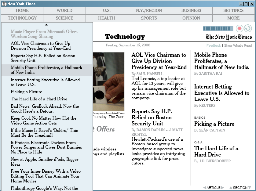 I just received an e-mail from the New York Times inviting me to try the new Times Reader software. Of course I didn't waste any time and went ahead to install it. Rather than talking too much I made a few screenshots for you. Some things worth mentioning: