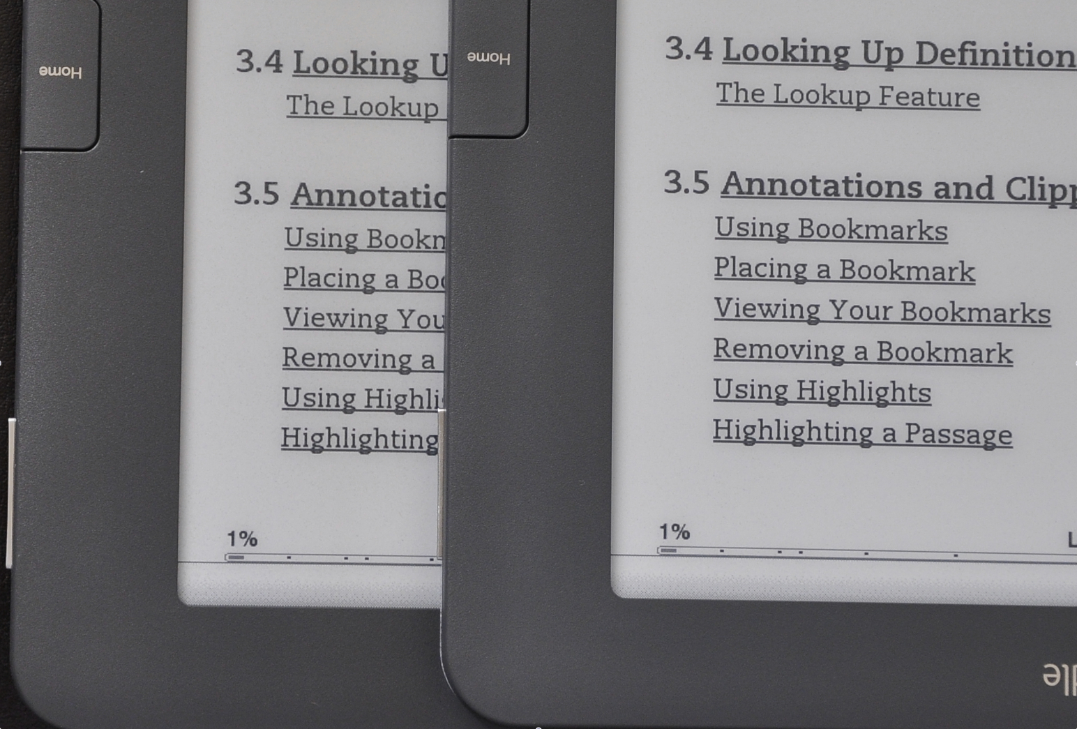 This doesn't really come as a surprise to me after having seen large display quality differences across different devices in both the Kindle and Kindle 2. But some of those could have been explained by later production runs which might have introduced better quality displays. The three devices I have on hand are presumably from similar runs, as the Graphite was just released. Now I'm starting to think Amazon is either not aware that there's a problem (doesn't seem likely...), or doesn't care enough to weed out the lackluster displays from their supplier, E Ink Corp. I believe the DX is priced high enough and its screen a big enough selling point that QC should be much better than it is. (better quality display on the right. sorry about the lower exposure in the second pic...sun was going down) Last edited by sweetbabyjames; 07-22-2010 at 11:24 PM. Reason: describe attached photos |