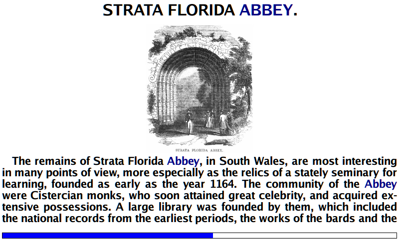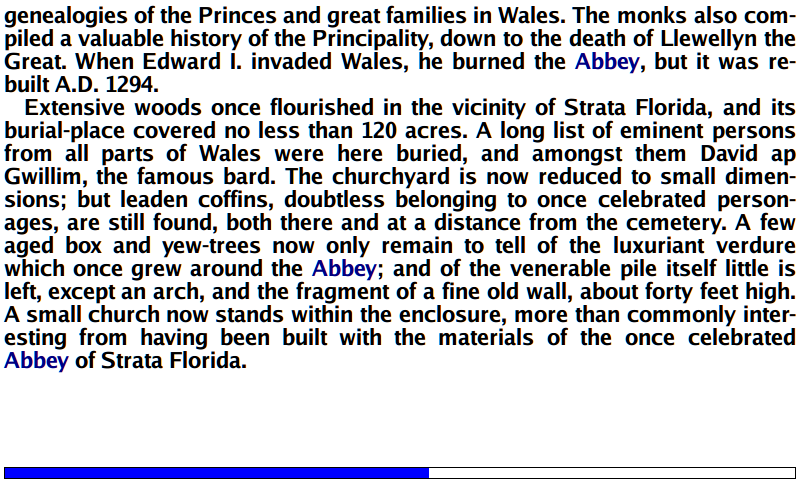 I used the HTML version of IllustratedLondonReader from Project Gutenberg, because deadite66 suggested that MobiPocket displays HTML. I think it is more accurate to say that MobiPocket imports HTML. Under Windows I imported the HTML using the new (beta) version 6.0 MobiPocket Reader, and copied the resulting .prc file to my PP3. The first 3 screen shots are from this document using the Java MobiPocket Reader. The graphics display well (smaller than the originals), but the reader is much less customizable than (say) the Windows 5.2 version. In particular the line spacing (double?) and the margins (very large) are not under user control. You can select the font and the font size. There are no rotation or page layout options. The PP3 isn't very comfortable in portrait mode, but a lack of screen rotation options might be significant on the iLiad. The next 3 screen shots are from the same file using FBReader (note that Abbey is in blue because I searched for this word). All its display characteristics are under user control, and I have it setup to display much more text per screen in a bold font. The page can be rotated (+90, +180, +270 degrees). However, it does not detect the hyperlinks in the .prc (actually .mobi) file. In fact, the PP3 and the Windows MobiPocket Readers have a hyperlinked CONTENTS section within the document but no "table of contents" in the menu, and FBReader has a table of contents in its menu but no in-line hyperlinks. FBReader can presumably be updated to detect the links. I tried a .prc from Baen, and it has a table of contents that is in the menu of all three readers. FBReader reads HTML directly, and the last 3 screen shots are FBReader on the original (zipped) HTML file. It now detects the hyperlinks. I also show one screen with the FBReader top panel, rather than in full screen mode. Note that the progress bar at the bottom can also be removed if you want. The PP3 Java version was ported by Pepper, and MobiPocket says that Pepper is in charge of how much functionality to provide. So it isn't clear if the Java version is actually much less capable than other versions of MobiPocket reader, or if Pepper did a minimal port. In any case, given the availability of FBRreader, I will only use the PP3 Mobi Reader if I ever buy an encripted e-book. Last edited by wallcraft; 01-30-2007 at 12:58 AM. |