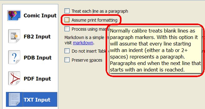 In the txt input area under Conversion - Input Options you can hover over the options and it tells you what the option does. See the attached image for the example from hovering over Assume Print formatting. It says 2 Spaces is converted to a paragraph, this sounds like what you are describing.