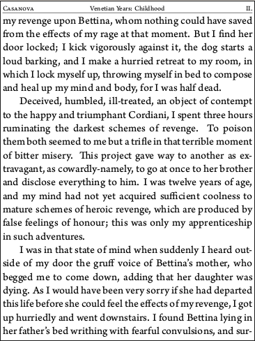 The considerable margins of paper books give a good bit of leeway for trickery that can help avoid them. While I've gotten rid of some outrageously ugly widows/orphans by forcing pagebreaks, I will not even try to get rid of less egregious ones. Even the LaTeX typesetting of this PDF is definitely subpar, by professional publishing standards, as I do not have the energy to attend to it as thoroughly as it requires... however, even like that, it still looks better than any eBook of Casanova's Memoires that I have ever seen. - Ahi |