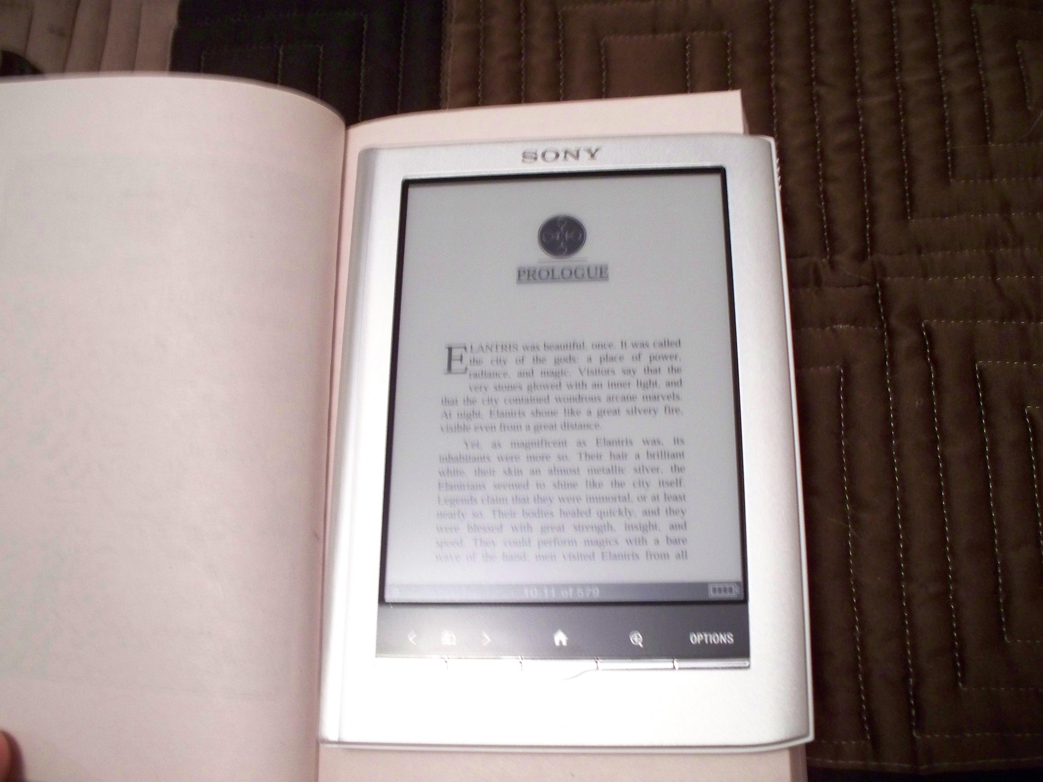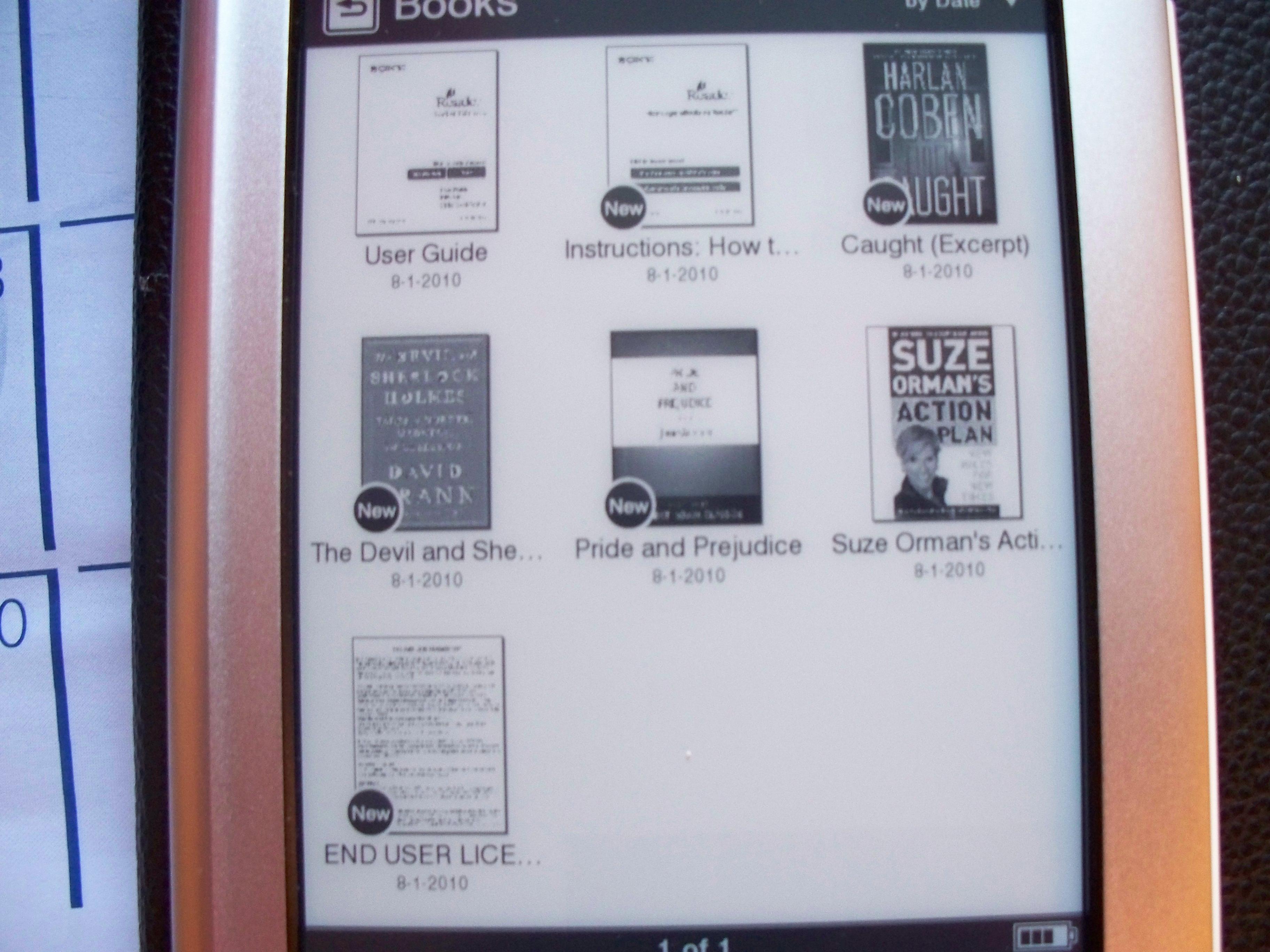 I'll have some pictures later. Right now I'm trying to figure out the MetaData issues that have popped up with Calibre. It seems that the Sony wants to ignore some of my cover images. The Path of Daggers shows a blank screen, some of the others show the original ePub cover, and others just have the title...It seems to be a Calibre issue right now, it looks like all my original cover art is what copied over, regardless of what the current stuff is. Maybe a corrupt dbf?
