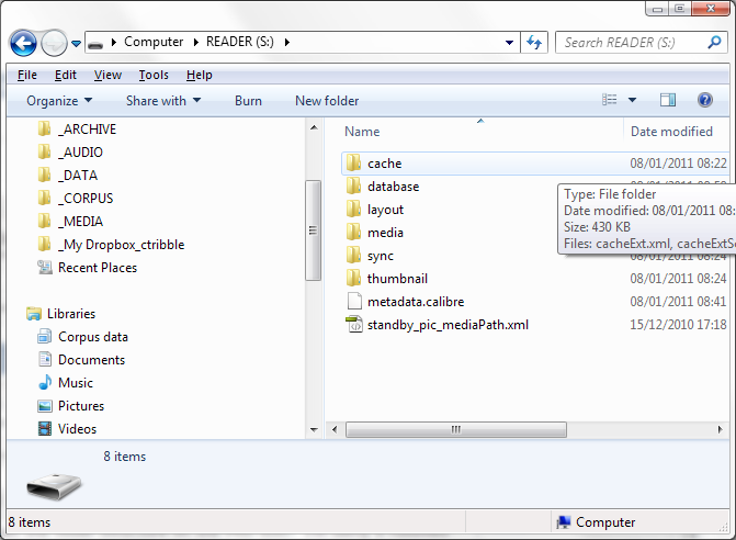 The directory structure at the root is in the first picture. What confuses me is that books can be found in the S:\database\media\books folder (next picture), and in S:\media\books. As it seems silly to keep two copies of each book on the device I'd like to remove one... Problem is I get confused as to which to take off. Any advice gratefully received. Thanks. Chris |