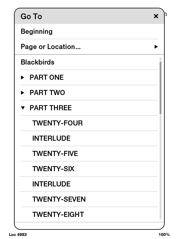 My Kindle 3 Wifi only has the following menu items: ![]() Can you please post a screen capture that shows the chapter selection menu on a Kindle Touch? |