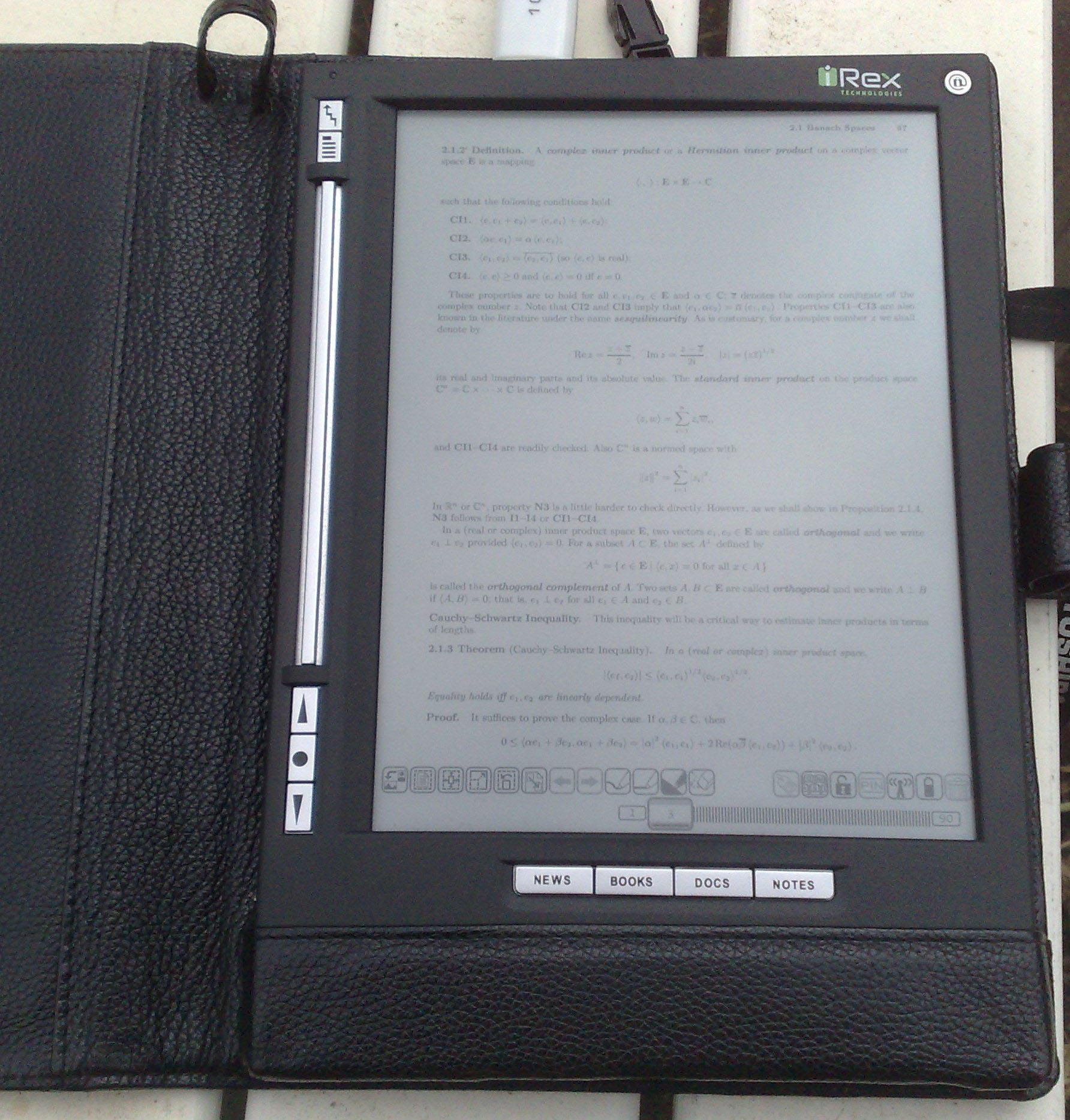 I currently own a BEBook and am perfectly happy with it, with one exception if I want to read technical pdf documents on it (especially mathematics) the screen is to small for me. The DR Reader seems to me the solution to this problem but I'm a little bit concerned about the bulk and portability of the reader and given the fact that most mathematical books are not in A4 format, I want to give the Iliad also a try. So my question is this, is there someone on this forum who has used both the Iliad and the DR Reader for reading technical documents like mathematics and can he comment if this can be done in a comfortable way on the Iliad or does he recommend that the only way to read this kind of text is using a A4 sized device like the DR Reader. Thanks a lot in advance. PS. If neede i can upload a pdf file containing the kind of material that I want to read |