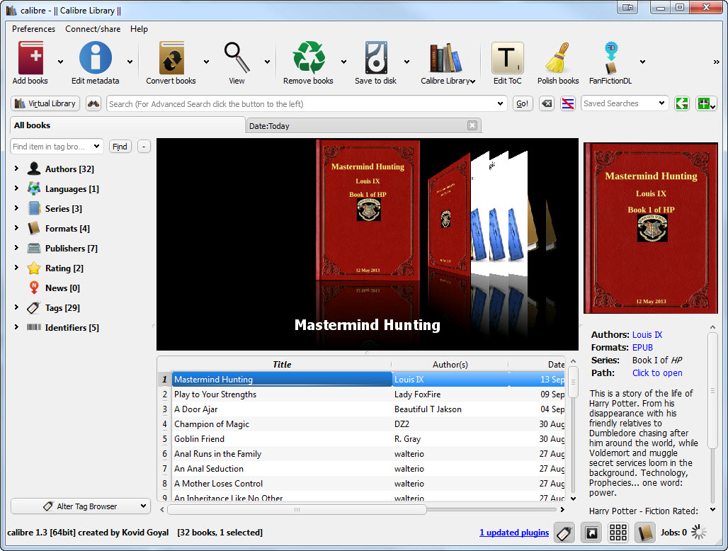 I've noticed that when I have a book selected in the 'All books' virtual library and then select the 'Date:Today' library and is there is no book in the the Date:Today library then the details pane retains the information from the book selected in the 'All books' library. Should the details pane not be blanked when switching to an empty library? Here is a couple of screen shots showing the issue. Rich |
