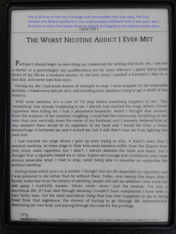 Hi, I've been away from the forum for a long time, so pardon me if this is common knowledge already. I installed the 3.4 update on my kindle keyboard just a month ago (I know, I've been living under a rock), and recently found a way to do achieve something I've wanted to do ever since I first bought my kindle - to reduce the font size so that it more closely matched the appearance of a pulp fiction paperback.