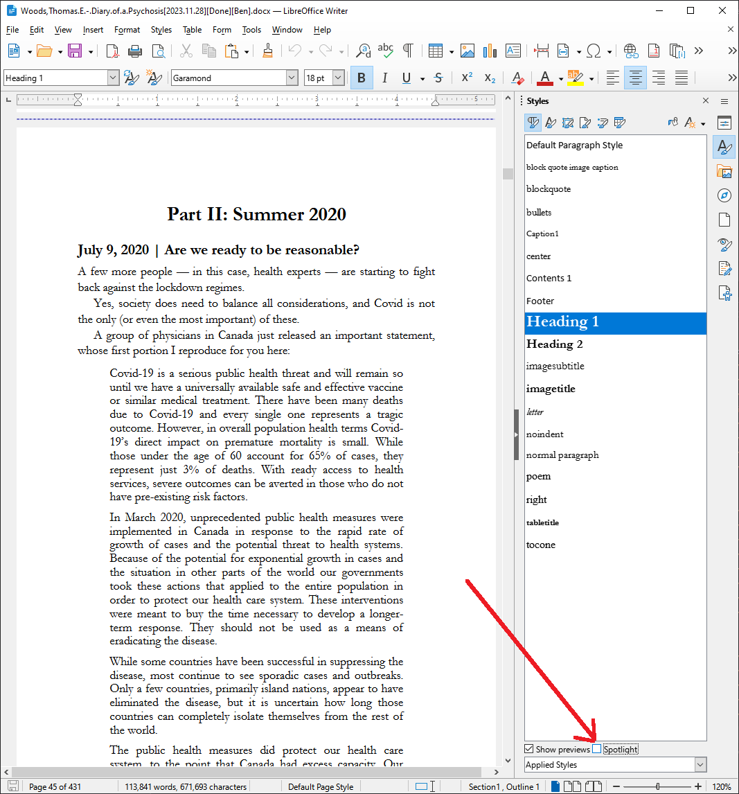 That'll lead you to hundreds and hundreds of posts where I/we covered this topic in detail over the years. ![]() - - - Side Note: And, make sure you're on the latest LibreOffice 7.6. They added this really fantastic "Styles Highlighter" feature called "Spotlight": You get to it by: