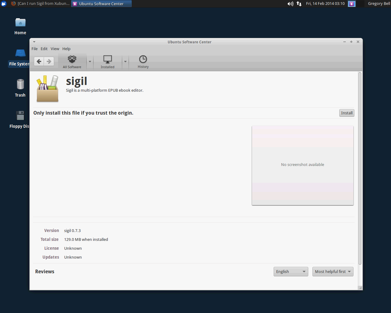I'm running Xubuntu 13.10 and several people made suggestions on how to download Sigil. I followed two and couldln't get it. The first one was the 004 screenshot. Everything went fine but when I got to the Ubuntu software center I could not find a way to refresh it, and I could not find the package in the Synaptic window.