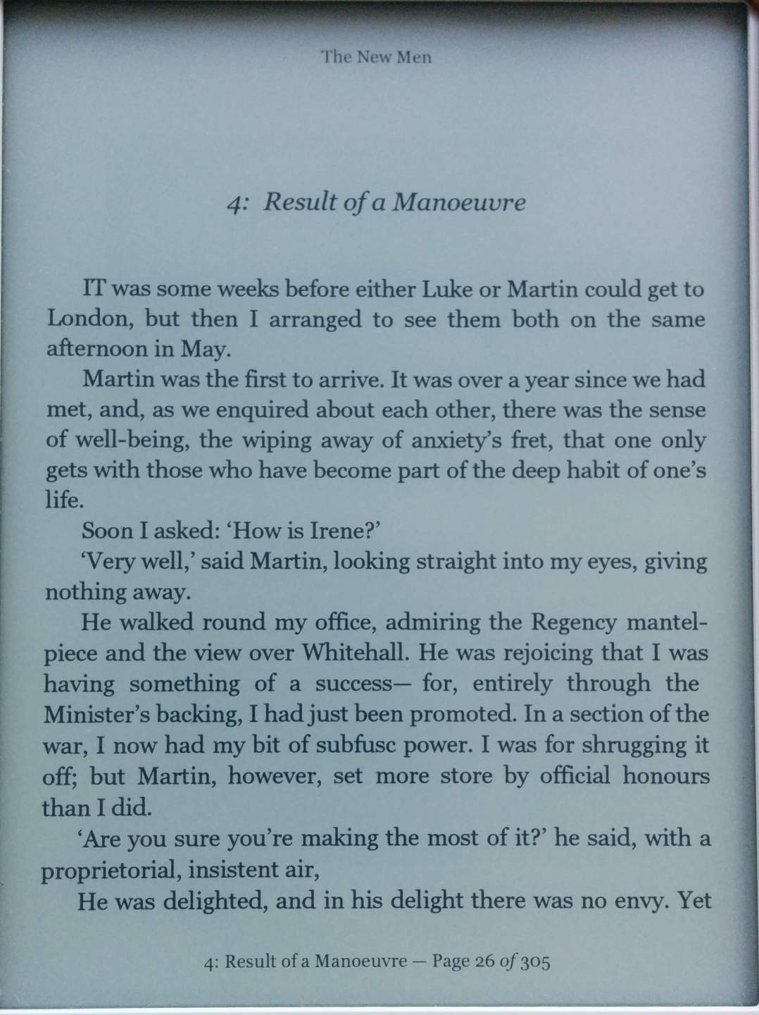This particular book is "The New Men", by C.P. Snow, but I see the same problem in multiple books from different publishers. And BTW, it's annoying that with this firmware I can no longer take direct screen shots but have to photograph the screen with a camera in order to get a screen image. p.s. What I forgot to mention is that the justification problem is related to the em dash problem, as lines containing an em dash that require stretching of the spacing also invariably have the justification problem. Last edited by Nick Payne; 06-02-2014 at 09:36 AM. |