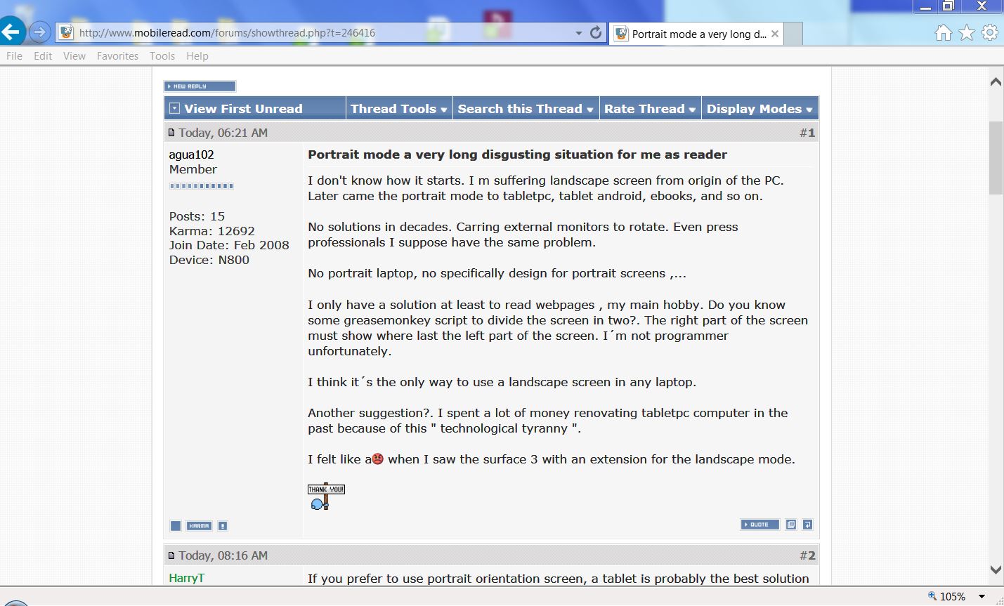 No solutions in decades. Carring external monitors to rotate. Even press professionals I suppose have the same problem. No portrait laptop, no specifically design for portrait screens ,... I only have a solution at least to read webpages , my main hobby. Do you know some greasemonkey script to divide the screen in two?. The right part of the screen must show where last the left part of the screen. I´m not programmer unfortunately. I think it´s the only way to use a landscape screen in any laptop. Another suggestion?. I spent a lot of money renovating tabletpc computer in the past because of this " technological tyranny ". I felt like a when I saw the surface 3 with an extension for the landscape mode.