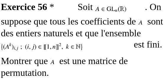 Soit <span style='display:inline-block; vertical-align:-0.211em; width:5.263em; height:1.105em;'><img src='exosetoiles_pict_463.png' style='width:100%;'/></span>. On suppose que tous les coefficients de <span style='display:inline-block; vertical-align:0.000em; width:0.711em; height:0.895em;'><img src='exosetoiles_pict_18.png' style='width:100%;'/></span> sont des entiers naturels et que l'ensemble <span style='display:inline-block; vertical-align:-0.316em; width:13.816em; height:1.316em;'><img src='exosetoiles_pict_464.png' style='width:100%;'/></span> est fini. Montrer que <span style='display:inline-block; vertical-align:0.000em; width:0.711em; height:0.895em;'><img src='exosetoiles_pict_18.png' style='width:100%;'/></span> est une matrice de permutation. As you see, zooming the image in another window is not always the solution. Thanks in advance for any help. Denis Last edited by dmonasse; 12-09-2014 at 11:59 AM. |