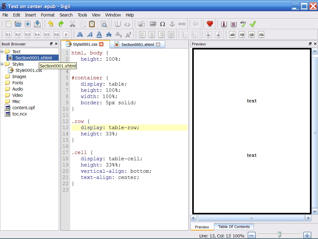 As you can see, I use a model of three rows and a "vertical-align: bottom". You can bring the text to the center of the screen all you want by changing the height of the rows (for example with the first and third rows with a height of 40% and the middle row with a height of 20% the text will be nearer the center). Of course, take in count that in order to use this code on ADE, you must convert the .epub I attach as epub3 and to use ADE 4 (or higher). Regards Rubén |
