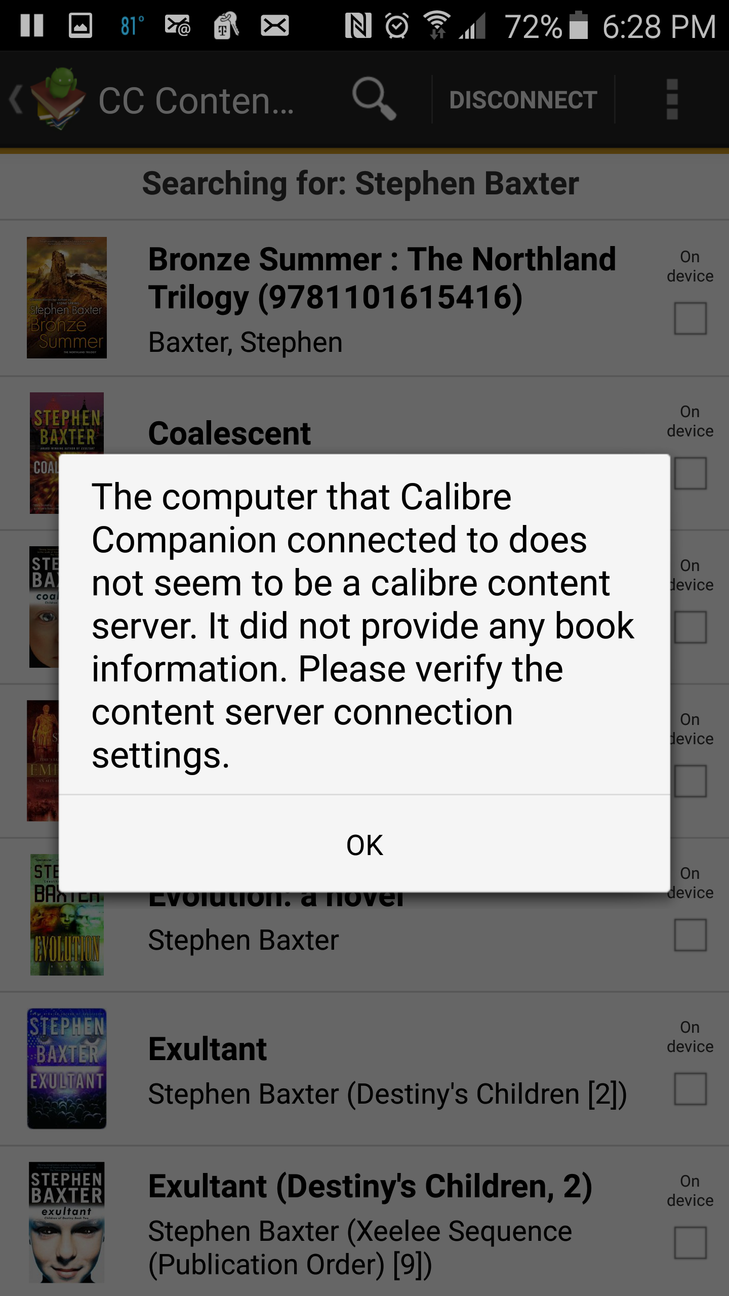 the list of books that were found, and displays the same error msg over the list of found titles. When I click okay to close the error box, CC disconnects from Calibre. ... MP |