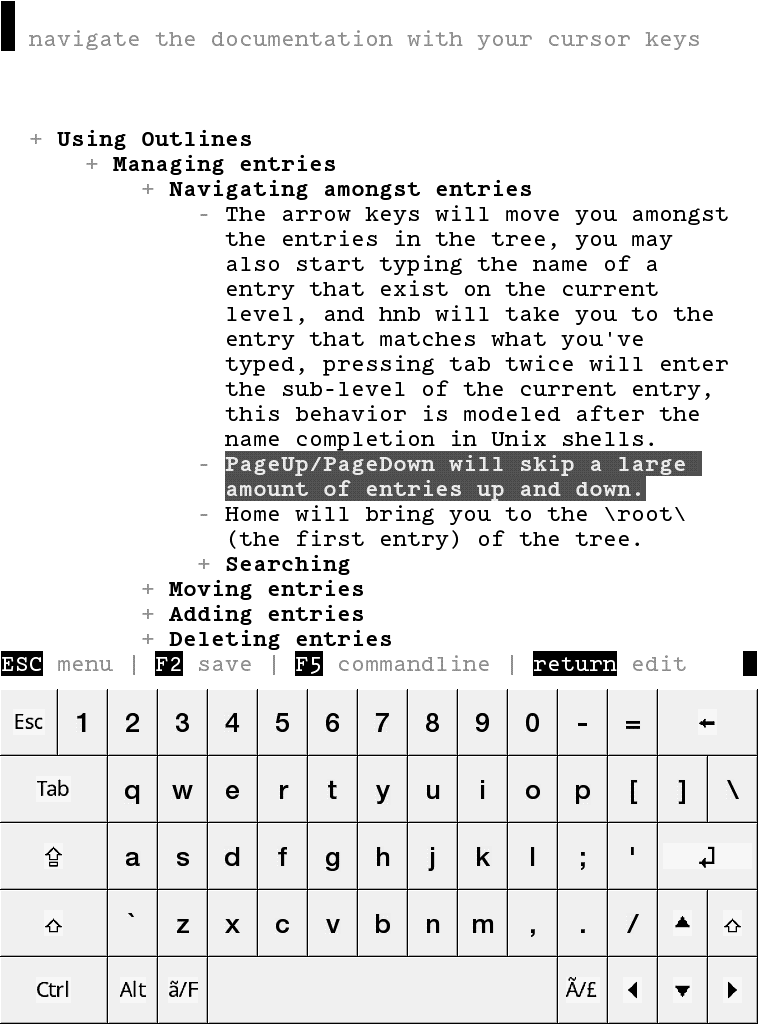 hnb - hierarchical notebook.This is a 2003 vintage Linux command line utility. It allows you to create a list of notes indented to any level. Author: Øyvind Kolås. Website: http://hnb.sourceforge.net/ From the man page: "hnb is an ncurses program to organize many kinds of data in one place, for example addresses, todo lists, ideas, book reviews or to store snippets of brainstorming, to make a structured packing list or just to take random notes. It can export ascii/html/latex/postscript, supports todo checkboxes, checkbox trees with percentages and searching. hnb uses a simple ascii file for storing your notes. This file can be specified on the command line. If not specified, ~/.hnb is loaded (or created if missing)." Porting: Though the source code is available, I just extracted the binary from the Debian-Jessie-Armel repository, added a library file and dressed it up in a KUAL package! Needs: Jailbroken Kindle, KUAL, kterm. Should work on: All Kindles from KT1 onwards. Tested OK on: PW1, PW3, KT3. Installation and usage: