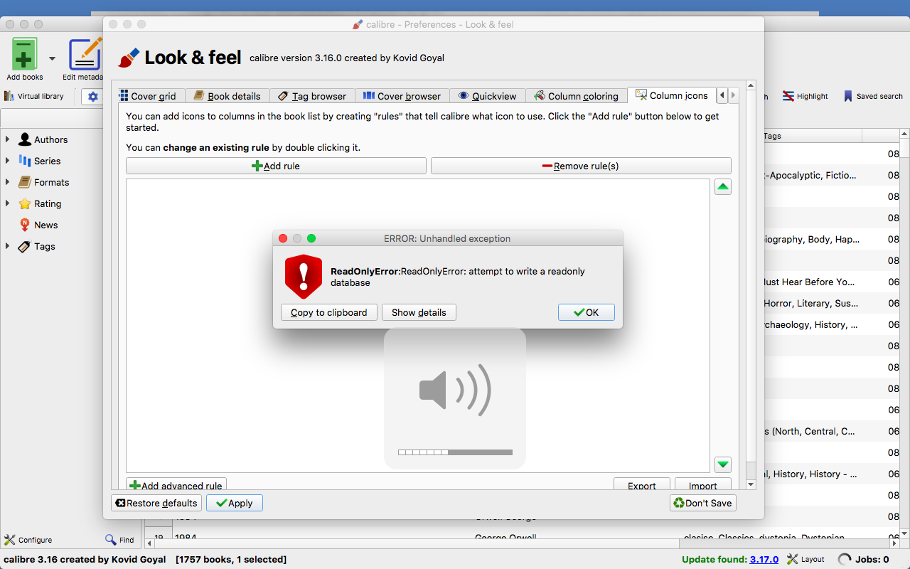 Apple? Try opening the Calibre Library directory with a file manager and try to create a folder (directory) and create a file inside that folder (directory). As long as Calibre isn't running at that moment nothing bad should happen. Calibre complains that the filesystem is read only, so have a look whether it is true. |