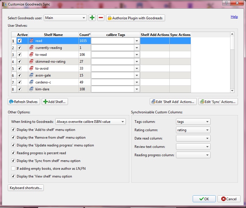 I have the Goodreads sync plugin, I have the Goodreads for downloading metadata plugin and I have the Count Pages plugin. I'm using calibre 3.31 in a W7 laptop. I've attached pictures for my customization of the plugins. Please tell me what I'm doing wrong. Also how and where can I customize to only download the goodreads ID and not ISBNs, ASINs or anything else |