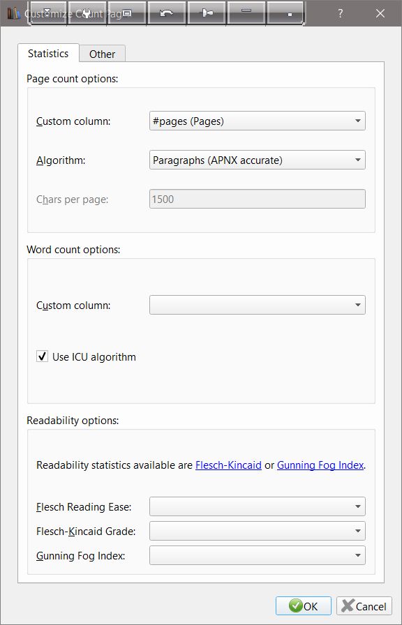 They each require a dedicated custom column., e.g. #pages, #words, #flesch, #flesch_kincaid, #gunning_fog I don't use the Goodreads plugins, so I can't help with those settings. BR |