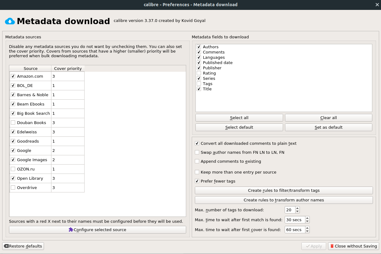 Hi, I am wondering if you would share your configurations for metadata. Is it better to use all/most the services Amazon, BN, Goodreads, etc.. to get quality metadata? Is there a defacto gold standard way of doing this?