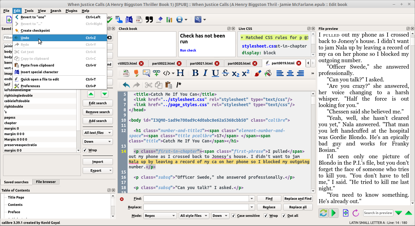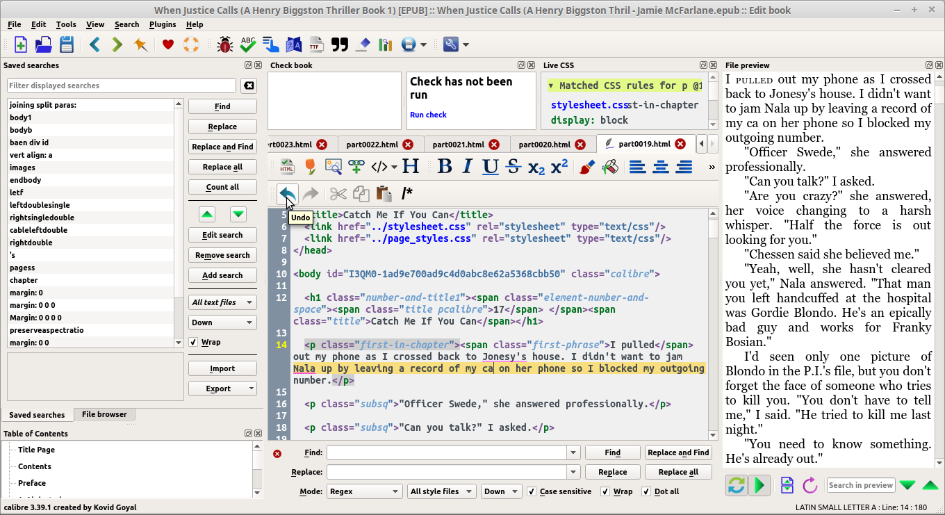 I have been a user of the Calibre editor from its beginning, but you can always trust me to get bitten... ![]() I was proofreading a book, and inserting a lot of corrections coming from a text page. After about one hundred of them (I had the feeling I had been saving my work from time to time), I just did a bad move and suppressed some words. Instinctively I hit the back button (à la LibreOffice) and was suddenly pushed back to the opening of the session. All my inserted corrections were gone (about one hour work). Of course, it's written. I am guilty. Yes. I think many users would be happy to be able to come back one step at a time. If we could choose in the Preferences the behaviour of this tricky back button (between last step OR last session), it would be a small step forward for civilization...