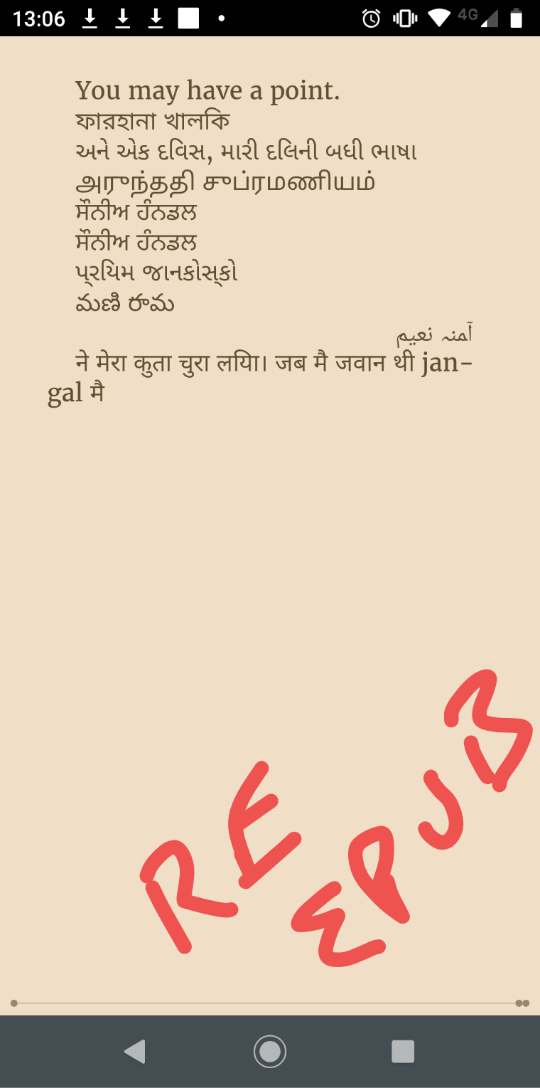 Odd rendering of Tamil characters in Adobe Digital Editions not resolved. Highlighted Gujarati text was just a formatting error on my side. I was curious so I converted to AZW3 and transferred this to my Kindle app on my android phone. The Tamil characters worked perfectly. I'm reading up on AZW3 and I think it's DRM protected. I ideally did not want this. If anybody can shed some light on the Adobe Digital Editions issue and opinions on AZW3? (And I've been hungry for a little while, but wanted to get this resolved. Time to cook and eat). |