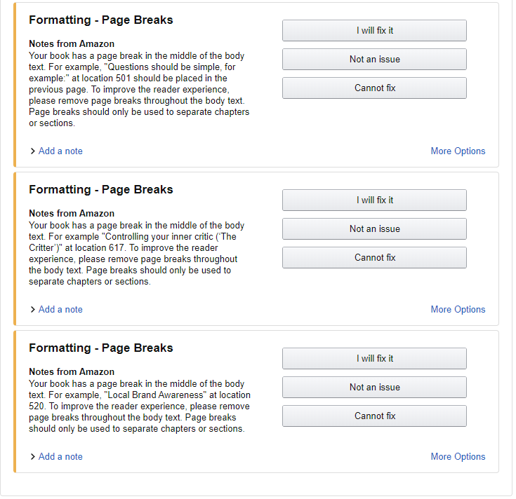 I suspect it was because I'd used some section headings with a distinctive css style but not tagged them as a header style. Alright, so I won't do that in future. But this book had been in the Kindle store for a year. Are Amazon tightening up their standards retrospectively? |