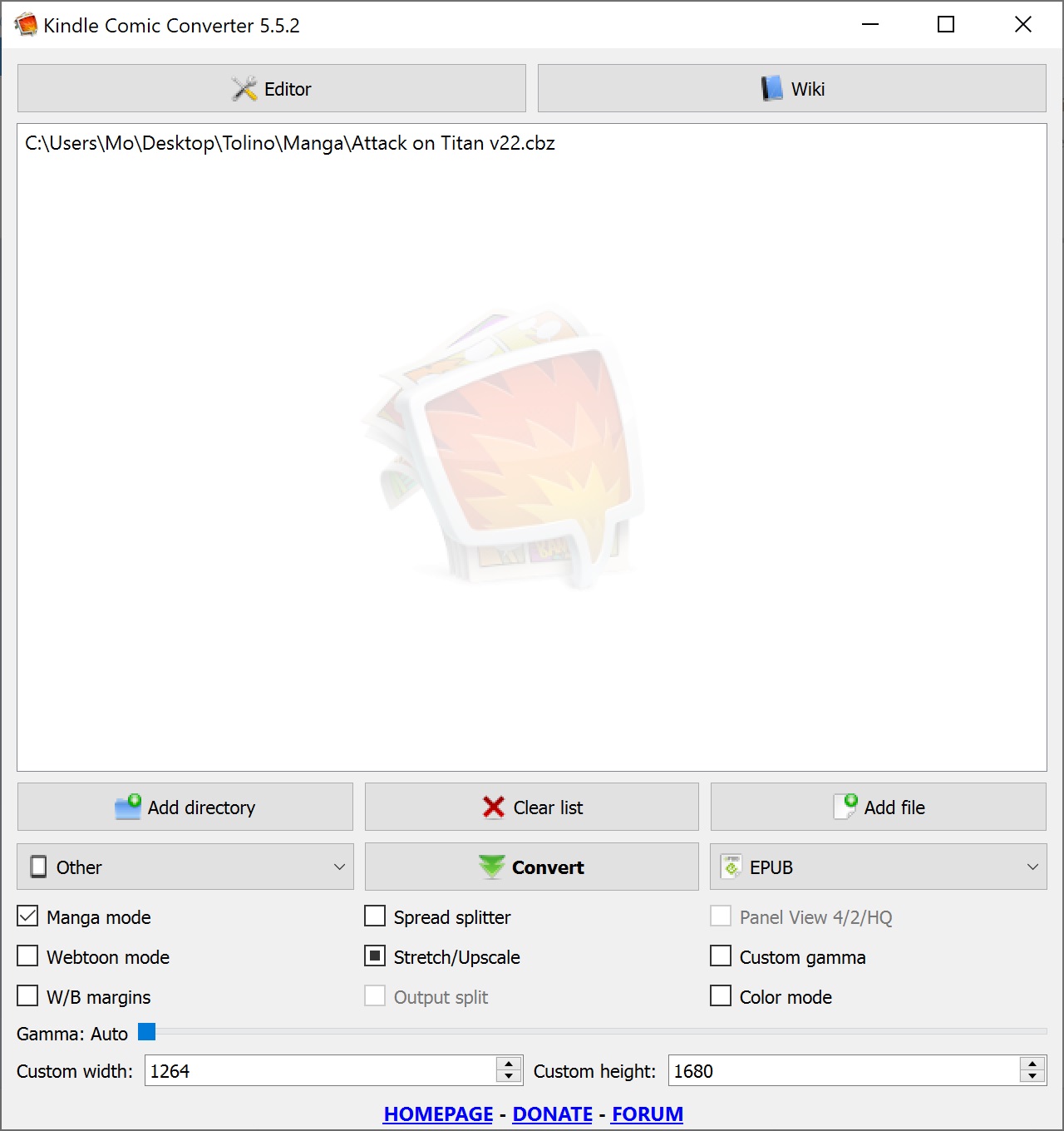 I need your help, please. I have a Tolino Vision 5 and want to read mangas with it. For this I used a Kindle Comic Converter, which actually worked quite well. It is just a little too long. When setting it before converting, I simply entered the resolution (1264 x 1680 ), as height and width. Since there is no Tolino to choose from there, I chose "Other". Normally the image fits perfectly. But since the number of pages is shown below the image, it probably has to be adjusted a bit smaller. Does someone have experience with the program and could recommend suitable settings to me? I have three pictures in the attachment: My Settings - What it looks like on my Tolino and what it should look like normally. Best regards ereado |
