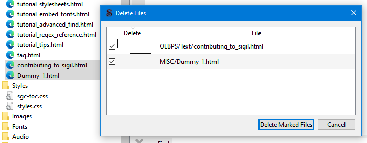 I tried doing what you suggested before I posted, but after clicking OK, I didn't see any changes in my book's file structure. The file I tried to move is still sitting in it's original location (the Text folder), and new folder I tried to create is nowhere to be seen. I saved the book, closed and reopened Sigil, but that made no difference. After reopening Sigil, attempting to move the file a second time resulted in an error about creating duplicate file with the same name -- but the original file hadn't moved; it was still in its original location, and there was no new folder created. I had expected that moving the file to a new folder would result in the creation of a new folder, with the file placed inside it. When I tried to move the file again, I got an error message about creating a duplicate file. Very strange! Sigil 1.20.0 on Windows 10, BTW. * later * I see the problem now. Sigil DID move the file, and it DID create the folder, but it did NOT update the Book Browser display. When I tried to delete the file, I saw in the confirmation dialog that file IS in a different folder. The problem is, the new folder is not displayed in the book browser window. It would be helpful it if were. |