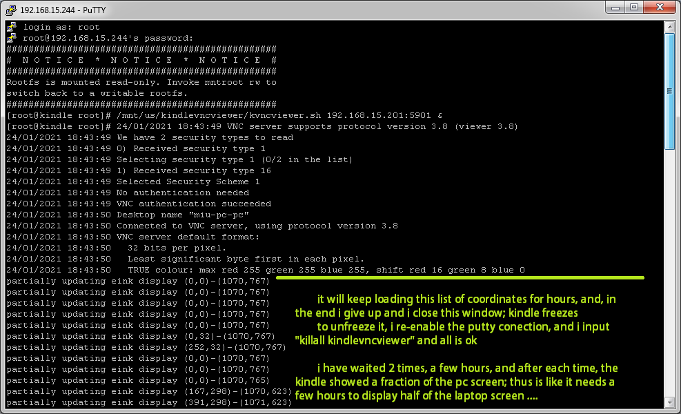 a few days ago, i saw on the internet that is possible to use a kindle as a 2nd monitor, so i thought to give it a goi don't have much experience with such related stuff, but i got a kindle pw3, and after reading info's on internet, i ended up on this thread; so far, i managed to : ... discover that my kindle is actually pw3, serial g090g1* ... install : ...... on kindle : ......... firmware 5.7.4 ......... kindle-jb-factory-1.2-r15011.tar.xz ......... JailBreak-1.16.N-FW-5.x-hotfix.zip ......... kindle-usbnet-0.22.N-r18011.tar.xz ......... kindlevncviewer.zip ...... on win 7 pc : ......... tightvnc-2.8.59-gpl-setup-32bit.msi ......... putty-0.74-installer.msi ......... turn off windows firewall ";usbnetwork" on kindle, plug it in, then putty, then it blocks, as shown in image 4 please, is there a way to make things work ? kindly ![]() ps : it took me a while to get so far, i mixed infos from different places, and most of the files i found here, on this thread; thanks to those that shared those, and i guess that is a bit involving, as seing that some files are updated several years in a row it seems there are some dedicated persons