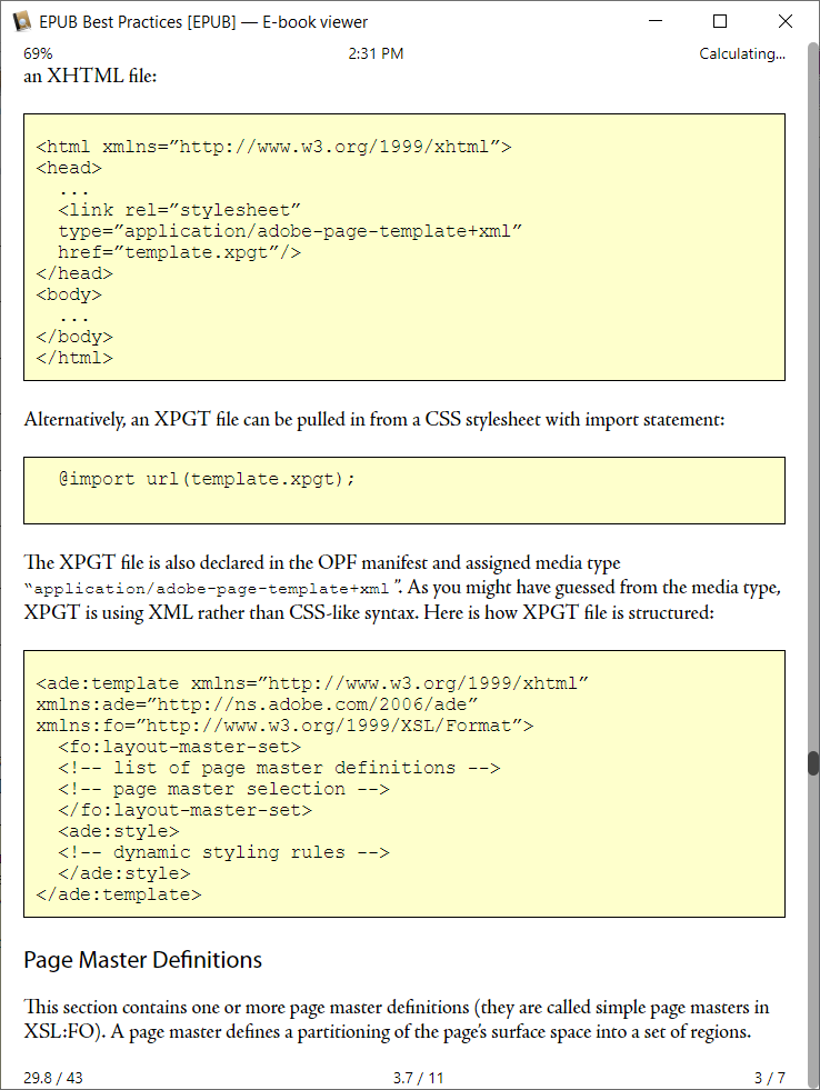 The only consistent page numbering scheme I know of for epubs are including an Adobe page-map or an epub pagelist which tie to a specific pbook's page numbering. The other option is Adobe's synthetic page numbering which is not dependent on font size, screen size, etc. It does have the limit that it only works when you have the identical epub file. And it is much easier to search for "the MDT task sequence takes additional instructions from the MDT rules" rather than trying to use page numbers. See attached images for ebook-viewer and ebook-viewer preferences. Note that the time to read needs a certain amount of page flips before usable information can be calculated. |