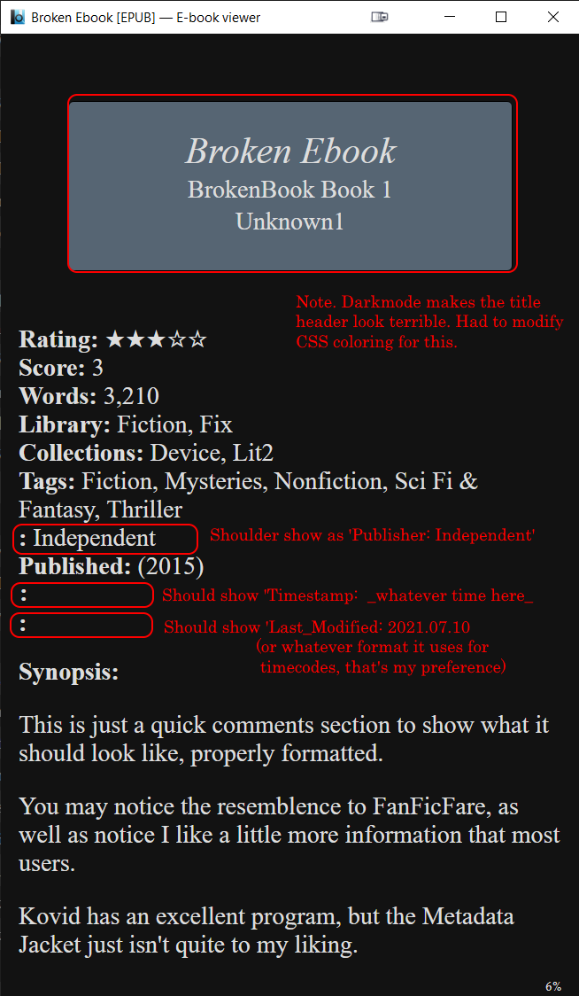 A long time ago I modified my jacket. It wasn't perfect, but it was okay. I really prefer (at minimum) showing size with words and/or pages. I upgraded my computer and decided I needed to get it right this time - something I like the look of more. So, I've been playing with the hacket HTML to get it to show more information such as Words (word count), Score (my personal star rating), Date (when it was added to my library) etc. Most of it seems to work fine, but there are a couple of information columns I'd like to add that don't seem to want to. First, I'd like to add the 'Date' Column - when it was added to my computer. given that {rating_label} and {tags_label} both work, I assumed that the other built in columns would be similar. For the labels, I tried several that don't seem to work. These include, but are not limited to (I didn't go through all of them): {publisher_label}, {timestamp_label}, {last_modified_label} The latter to don't matter as much, as barring some issues, they're ALWAYS there, so I can just overwrite them as 'Added Date' and 'Last Modified' but I'm just noting they don't work. In other cases, specifically publisher, I would like to have a label there, and I could manually enter it, just putting the actual name (IE Publisher: instead of {publisher_label}) but the problem is that that particular column isn't always filled, and doesn't allow the element to disappear if the information doesn't exist. The other larger problem is the actual information. While {pubdate} works fine,{timestamp} and {last_modified} do not. I can't seem to find what other value they may be under, or if I need to format them somehow (I'd love that, as I prefer my date format backwards from what most people do). I have read the forums looking for answers, as well as the 'Overriding icons, templates, et cetera' area of the help manual. It's possible I've missed something or am not using the correct phrasing in search. Can anyone help me out? I've attached a sample template just so someone can look at it if they'd like, as well as a sample of what my jacket problem looks like with comments. |