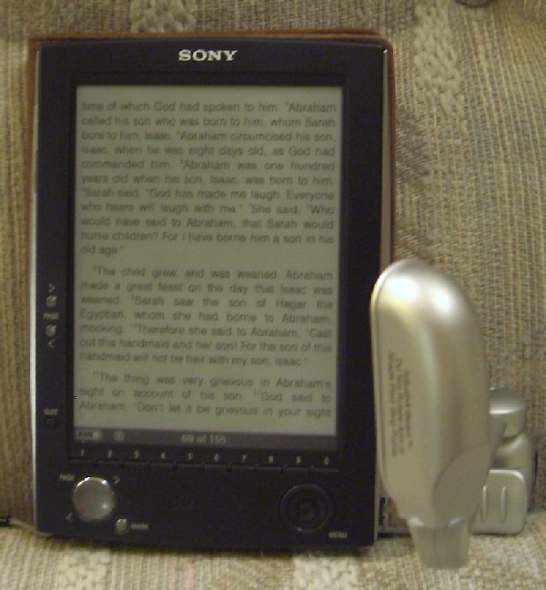 This light seems to go by several names: "NaturaLamp Full Spectrum Daylight Book Light," "Sight Reader," (the particular one I'm reviewing), and another that seems to be the same, though it's priced $10 more, "CoolGlo Full Spectrum Daylight" (the specs are mostly the same, though this one includes a 'durable gig bag'). It's available from a number of places besides directly from MightyBright: Amazon, Musician's Friend, Gieardinelli -- I even saw one at Borders last night -- and the prices vary anywhere from $20 to $30. Physical attributes: • weight with batteries, a bit more than the Reader, so 10~12oz. at a guess Articulation:• batteries: 4 AA • bulb length: 1.5" • head length: 1.75" • arm length: 4.75" • battery compartment: 5.75" X 1.5" X .75" • sliding switch on the end of the battery compartment closest to the arm connection • shade rotates in its long axis ~ 170° • shade bends with respect to the arm ~ 180° • head rotates with respect to the arm ~ 350° • arm rotates with respect to the battery compartment ~350°(this rotation is 'notched' in that it rotates in a series of clicked steps, thought it doesn't make any sound to speak of) Okay, now that the details are dealt with, let me begin by saying that I found this light very agreeable to read from my Reader by. The full spectrum light makes the display very 'contrasty' (see attached photo), and due to the length of the arm, it easily and evenly lights the entire display. The 'business parts' of the large clip are lined with a neoprene-like substance, which means it's very kind to the Reader's cover, and the size of the clip means that it will clip comfortably on any edge of that cover. I found that either side works best for me, though the weight of the light with batteries means that it's most comfortable clipped to the very bottom of the cover where it actually makes the reader almost stand on its own. Not quite, but it does make it easier to hold up. The dimensions of the arm mean that when it's clipped to bottom edge of the cover, on the right-hand side, the head of the lamp is pretty close to centered vertically on the display. The rotating shade means that most of the spillover light goes off to one side, nice for those whose Significant Others are light sensitive. It seems that I was correct in my guess that the thing is a battery hog. I'm using 2050 mAh NiMh rechargeable batteries, so it's not that big a deal, but I actually saw the light noticeably dim after about 4 hours of use. It's still plenty bright to read by, and I don't know yet how long it will run before it gives it up, but that should be adequate run time to allow for a 'read at night, charge in the day' cycle. There is a wall-brick available for it, but it doesn't charge batteries (it specifically warns to remove them before connecting the AC adapter). In short, I'm pleased with the light, and if the limitations don't crimp your style, you might be pleased with it too. Note, the lighting sample picture below, was taken in darkened, windowless room, on batteries that had been used for ~5 hours, so it's actually noticeably (though not radically) brighter on a fresh set. I'll try to add another one when they've recharged. The glare (which isn't as bad in real life) can be eliminated by angling the Reader slightly -- easier done while reading than photographing.
