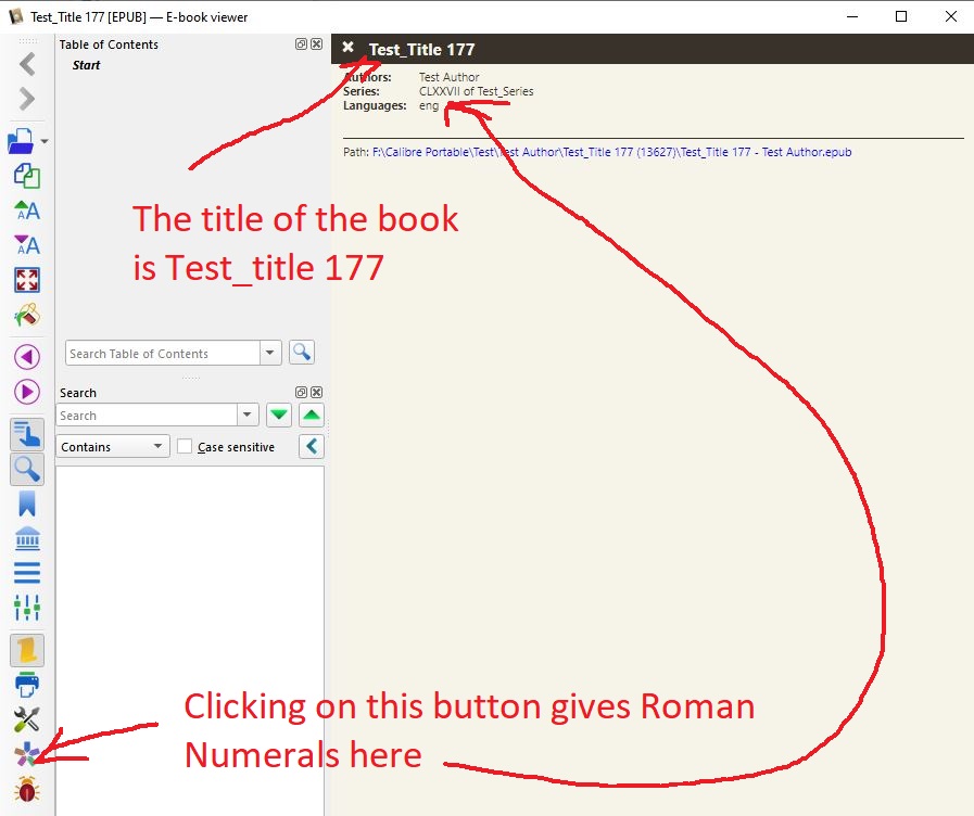 My problem is with the E-bookl viewer from calibre, which I use to read books from my calibre library on my computer. That is why I posted this question in this viewer forum and not in the general forum. So to make my question clear: In calibre (main program) everything is set to Arabic numerals and that works fine also in the book details. Also the metadata jacket page inserted into epub files shows series numbers as Arabic numerals. But not the E-book viewer. Attached is a screenshot of a book I created to test this problem. The title is Test Book 177 and the series index is also 177, but as you can see displayed in Roman numerals. |